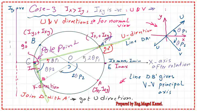 In Mohr’s circle of inertia-third case-part 2 we need two mirror points. Setting point A’, which is a mirror of point A and has a coordinate of (Ix,+Ixy), and gives the direction of the maximum moment axis U. This point A’ will enable us to rotate the x-axis or line OA a clockwise rotation by the value of 2θp1. The x-axis will be horizontal; the U line will also have a new direction represented by line OA’.